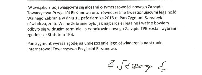 Niestety, Pan Zygmunt Szewczyk postanowił przejść jak to sam określił „w końcu na emeryturę”. Członkowie TPB przez aklamację podjęli uchwałę o nadaniu Panu Zygmuntowi tytułu Honorowego Prezesa Towarzystwa Przyjaciół Bieżanowa.