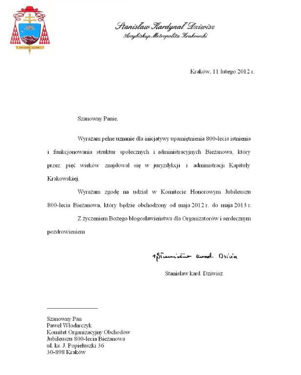 W Komitecie Honorowym Jubileuszu 800-lecia Bieżanowa brał udział także kardynał Stanisław Dziwisz.